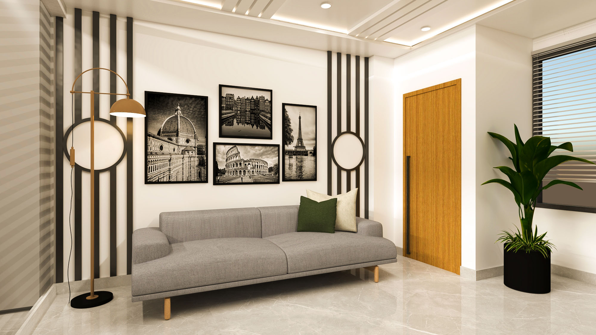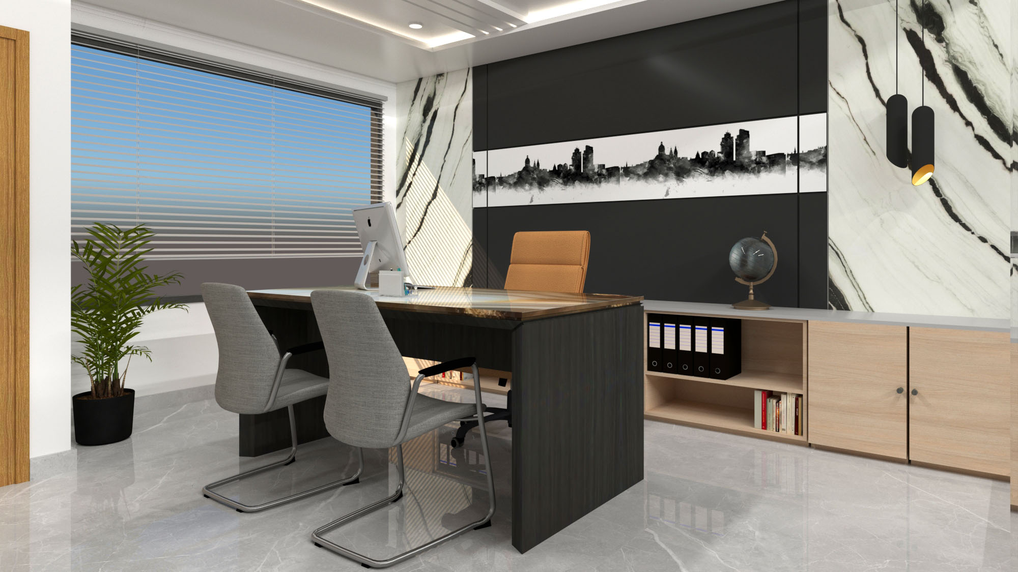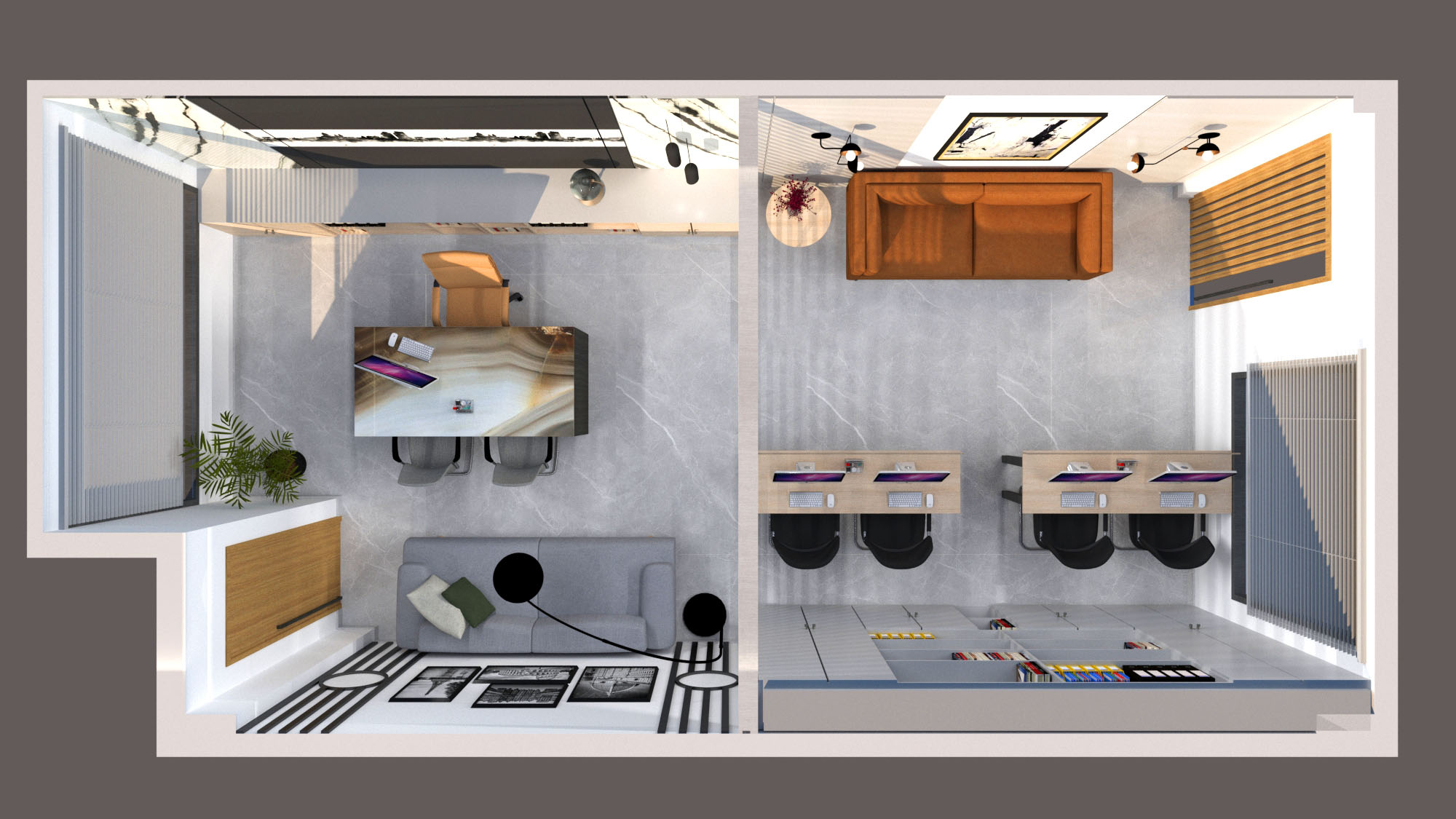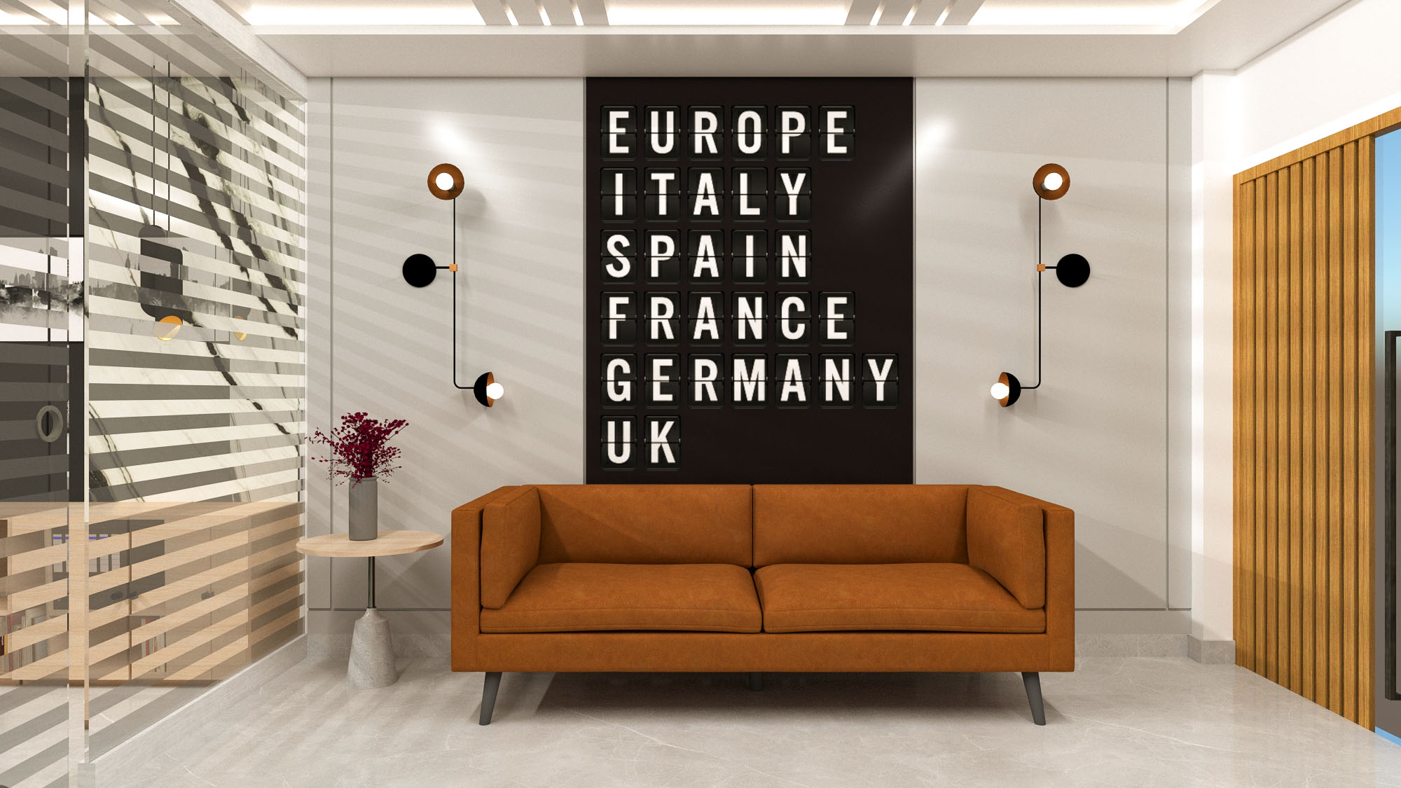 A vibrant travel agentβs office designed to energise and inspire – featuring a lively accent wall, playful textures, and fresh colours that evoke movement, exploration, and a sense of adventure.